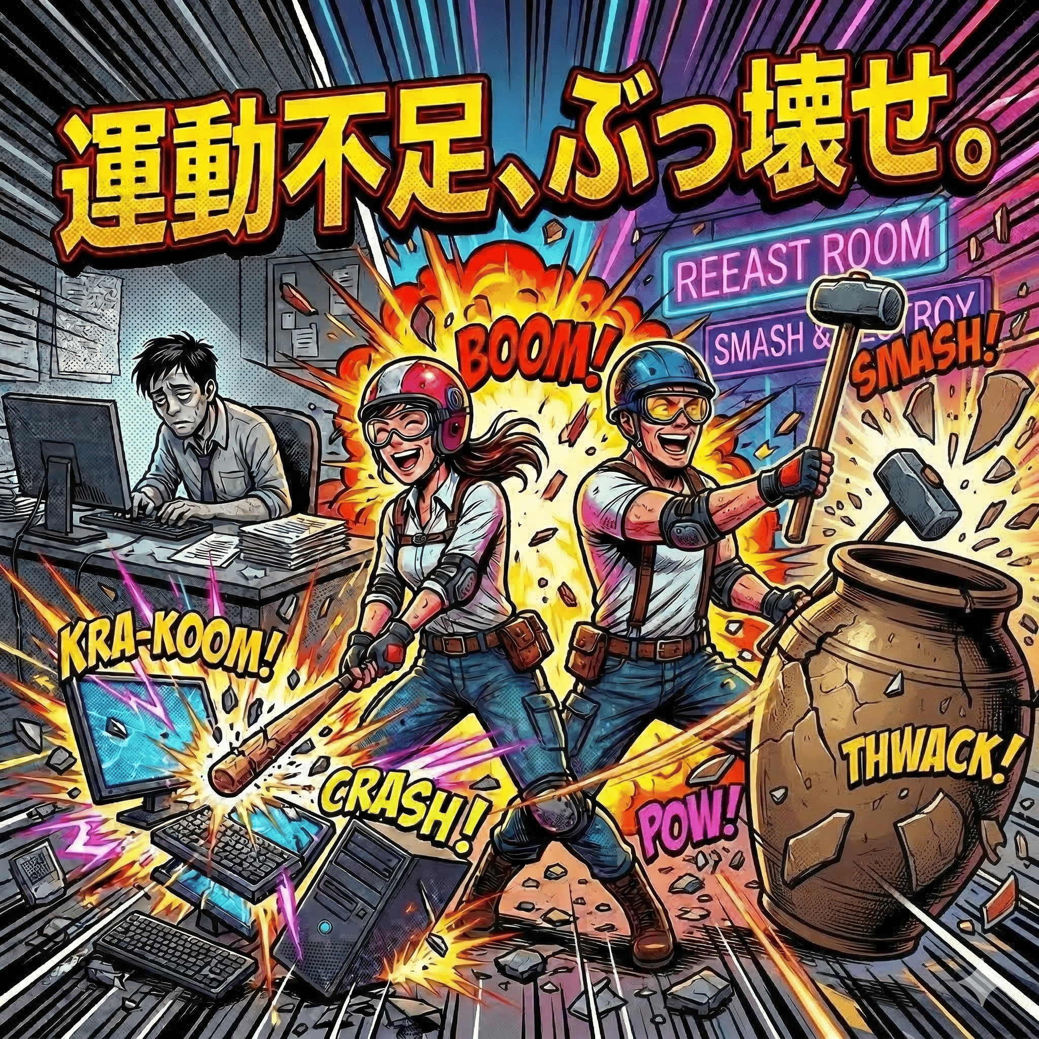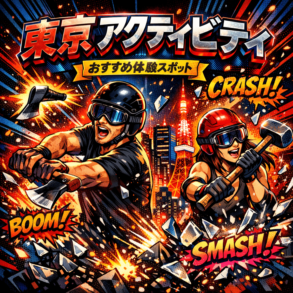 部屋内にあるバットやハンマー・バールといった様々な武器でお皿や瓶、電子レンジなどの家電を思いのままにぶっ壊し、圧倒的なストレス発散!圧倒的な爽快会を体験こできます。