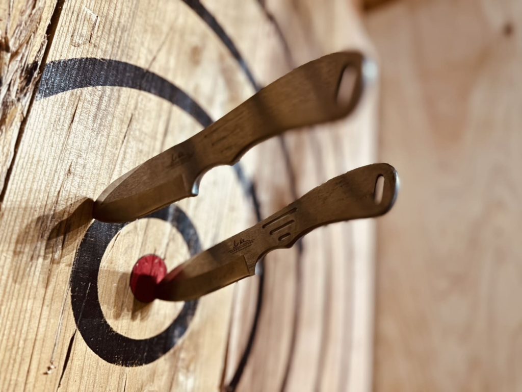 斧投げは海外では人気のスポーツで、木の的に向かって斧を投げて得点を競うゲームです。